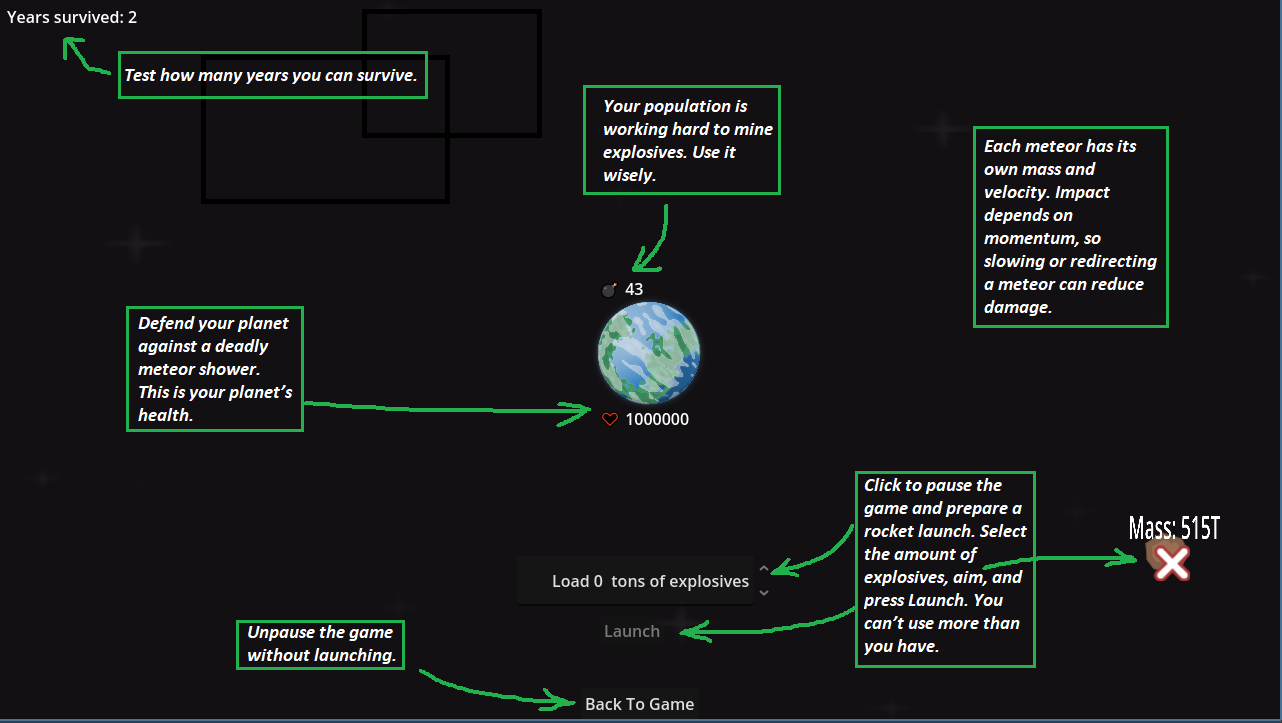 Protect your planet from relentless meteor storms in this resource-management survival challenge! Build and launch rockets to intercept incoming meteors, but beware—your explosive supply is limited.